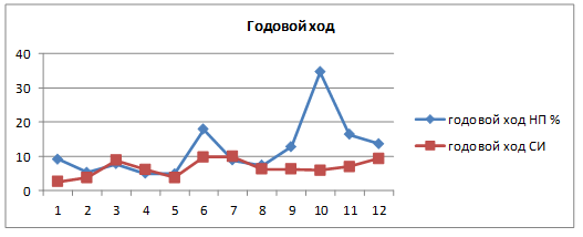 Годовой ход загрязнения атмосферы. На рисунке представлен годовой ход СИ и НП сероводорода за период апрель 2024 г. – март 2025 г. В годовом ходе в городе более высокое значение СИ отмечено в июне, сентябре, октябре 2024 года и марте 2025 года по сероводороду. НП в пределах 20-30% зафиксированы в сентябре 2024 года, январе, феврале 2025 года.