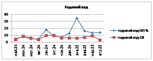 Годовой ход загрязнения атмосферы. На рисунке представлен годовой ход СИ и НП за период май 2024 г. – апрель 2025 г. В годовом ходе в городе более высокое значение СИ отмечено в июне, сентябре, октябре 2024 года и марте 2025 года по сероводороду. НП в пределах 20-30% зафиксированы в сентябре 2024 года, январе, феврале 2025 года.