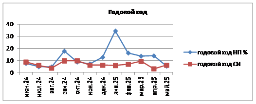 Годовой ход загрязнения атмосферы. На рисунке представлен годовой ход СИ и НП за период июнь 2024 г. – май 2025 г. В годовом ходе в городе более высокое значение СИ отмечено в июне, сентябре, октябре 2024 года и марте 2025 года по сероводороду. НП в пределах 20-30% зафиксированы в сентябре 2024 года, январе, феврале 2025 года.