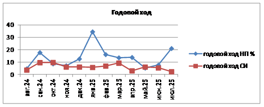 Годовой ход загрязнения атмосферы. На рисунке представлен годовой ход СИ и НП за период август 2024 г. – июль 2025 г. В годовом ходе в городе более высокое значение СИ отмечено в сентябре, октябре 2024 года и марте 2025 года по сероводороду. НП в пределах 20-30% зафиксированы в сентябре 2024 года, январе, феврале, июле 2025 года.