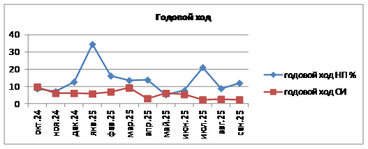Годовой ход загрязнения атмосферы. На рисунке представлен годовой ход СИ и НП за период октябрь 2024 г. – сентябрь 2025 г. В годовом ходе в городе более высокое значение СИ отмечено в октябре 2024 года и марте 2025 года по сероводороду. НП в пределах 20-30% зафиксированы в январе, феврале, июле 2025 года..
