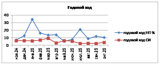 Годовой ход загрязнения атмосферы. На рисунке представлен годовой ход СИ и НП за период ноябрь 2024 г. – октябрь 2025 г. В годовом ходе в городе более высокое значение СИ отмечено в марте 2025 года по сероводороду. НП в пределах 20-30% зафиксированы в январе, феврале, июле 2025 года.