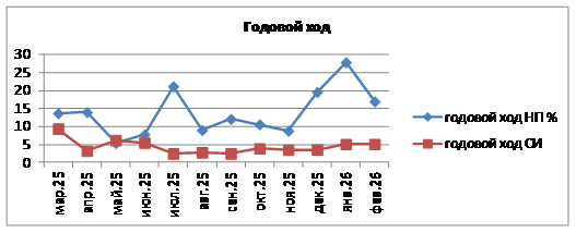 Годовой ход загрязнения атмосферы. На рисунке представлен годовой ход СИ и НП за период март 2025 г. – февраль 2026 г. В годовом ходе в городе более высокое значение СИ отмечено в марте 2025 года по сероводороду. НП в пределах 20-30% зафиксированы в июле, декабре 2025 года, январе 2026 года.