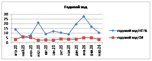 Годовой ход загрязнения атмосферы. На рисунке представлен годовой ход СИ и НП за период апрель 2025 г. – март 2026 г. В годовом ходе в городе более высокое значение СИ отмечено в мае 2025 года по сероводороду. НП в пределах 20-30% зафиксированы в июле, декабре 2025 года, январе 2026 года.